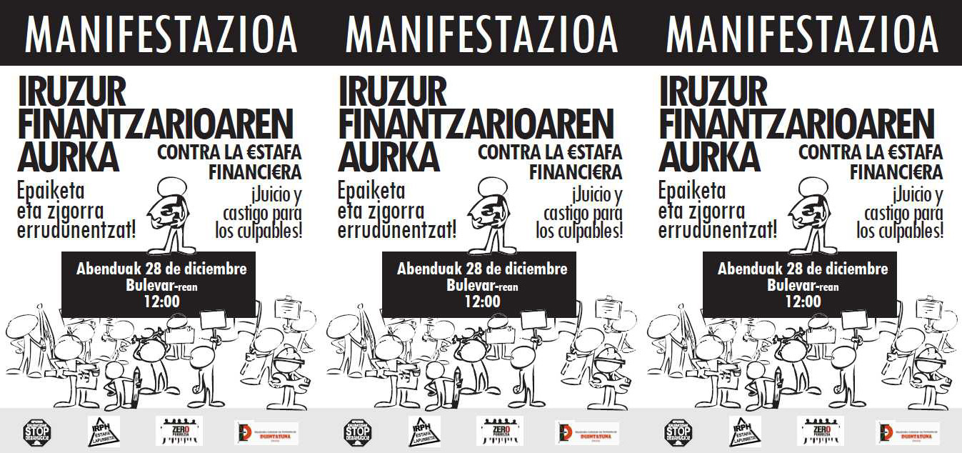 Abenduaren 28an kalera irtengo gara iruzur finantziarioa eta herritarron txirotzea salatzeko. Era berean, errudunentzat epaiketa eta zigorra exigituko ditugu.