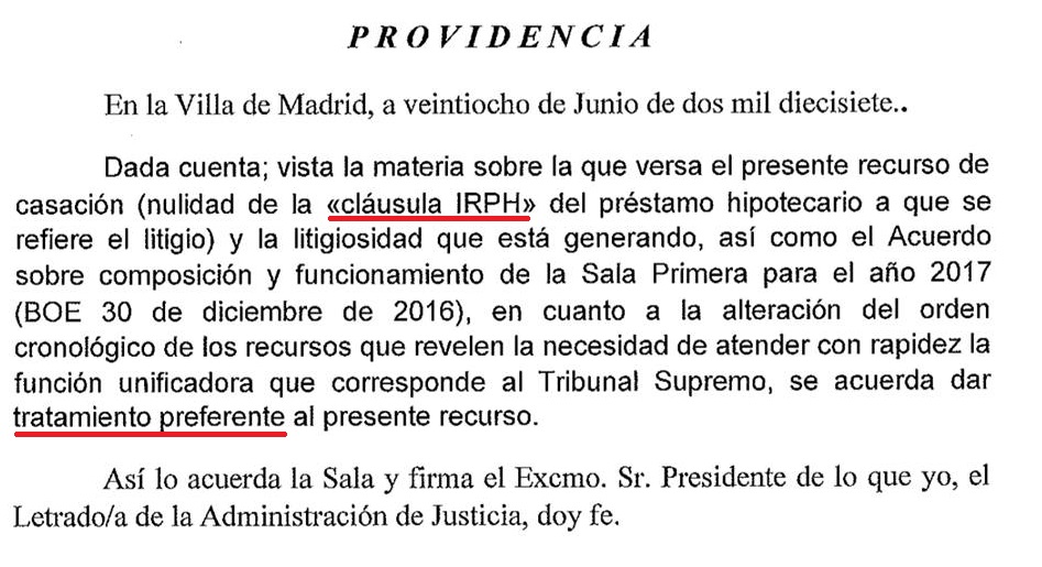 Abokatuek ezagutzera eman dutenez, Espainiako Auzitegi Gorenak kasuaren azterketa azkartzea erabaki du, IRPHa sortzen ari den eztabaida eta auzibide kopurua dela eta. Modu honetan, gaiari lehentasunezko tratua ematea erabaki du Gorenak. Helegiteen hurrenkera kronologikoa aldatzea dakarren neurri bat da, eta ondorioz aurretik ziren beste kasu batzuk baino lehenago aztertuko dute IRPHaren gaia. Modu honetan Auzitegi Gorenari dagokion eginkizun bateratzaileari erantzun azkarra bilatzen omen dute. Probintzia Auzitegi ezberdinek IRPHaren inguruan dituzten irizpide ezberdinak batzearen inguruan ari dira.