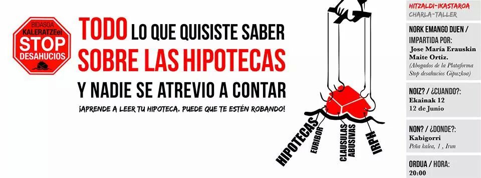 Bestalde, salatu nahi dugu estatu espainiarrak ez duela betetzen 93/13/CEE europar zuzentaraua, ez baitu kontsumitzaileekin egiten diren kontratuetan abusuzko klausularik ez egotea zaintzen. Ondorioz, gaur epaitegietara etorri eta tasa judizialak ordaintzera behartu gaitu, Kaleratzeak Stop-eko abokatu eta prokuradoreek musutruk ematen diguten laguntzarekin.