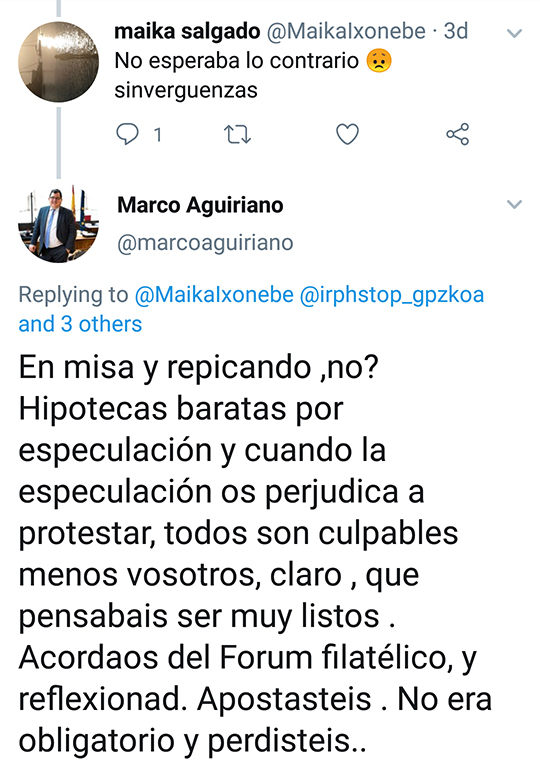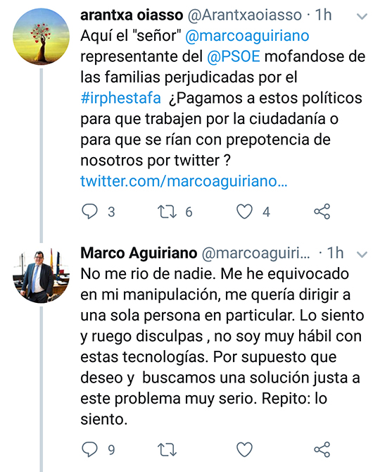 Y aunque lo explicado sea algo obvio, parece que la aclaración era necesaria, pues en los últimos días hemos constatado que existe un intento por hacer creer que las familias que firmamos nuestros préstamos referenciados a IRPH lo hicimos en unas condiciones favorables que luego se nos volvieron en contra. Nos estamos refiriendo a un mensaje de un alto cargo del Gobierno de España, más concretamente de su Secretario de Estado para la Unión Europea, el miembro del PSOE Marco Aguiriano. El señor Aguiriano es responsable de la Abogacía del Estado ante el TJUE, que en el asunto del IRPH, y en representación del estado español, está defendiendo los intereses de la banca y actuando por tanto en contra de las personas afectadas. Muchas de estas personas escribieron a Marco Aguiriano en Twitter antes y después de la vista oral del 25 de febrero, y este respondió acusando a las familias afectadas de especular con «hipotecas baratas» y de creerse «muy listos». Según el Secretario de Estado, las familias afectadas apostamos y perdimos. Se trata de un tweet escrito a altas horas de la madrugada, y al que acompañaron otros mensajes en los que el Sr. Aguiriano se burlaba de las faltas de ortografía y de la reducida cantidad de followers de algunas de las personas que se dirigieron a él. El Secretario de Estado borró los mensajes al día siguiente y pidió disculpas, pero su postura ya nos ha quedado clara.