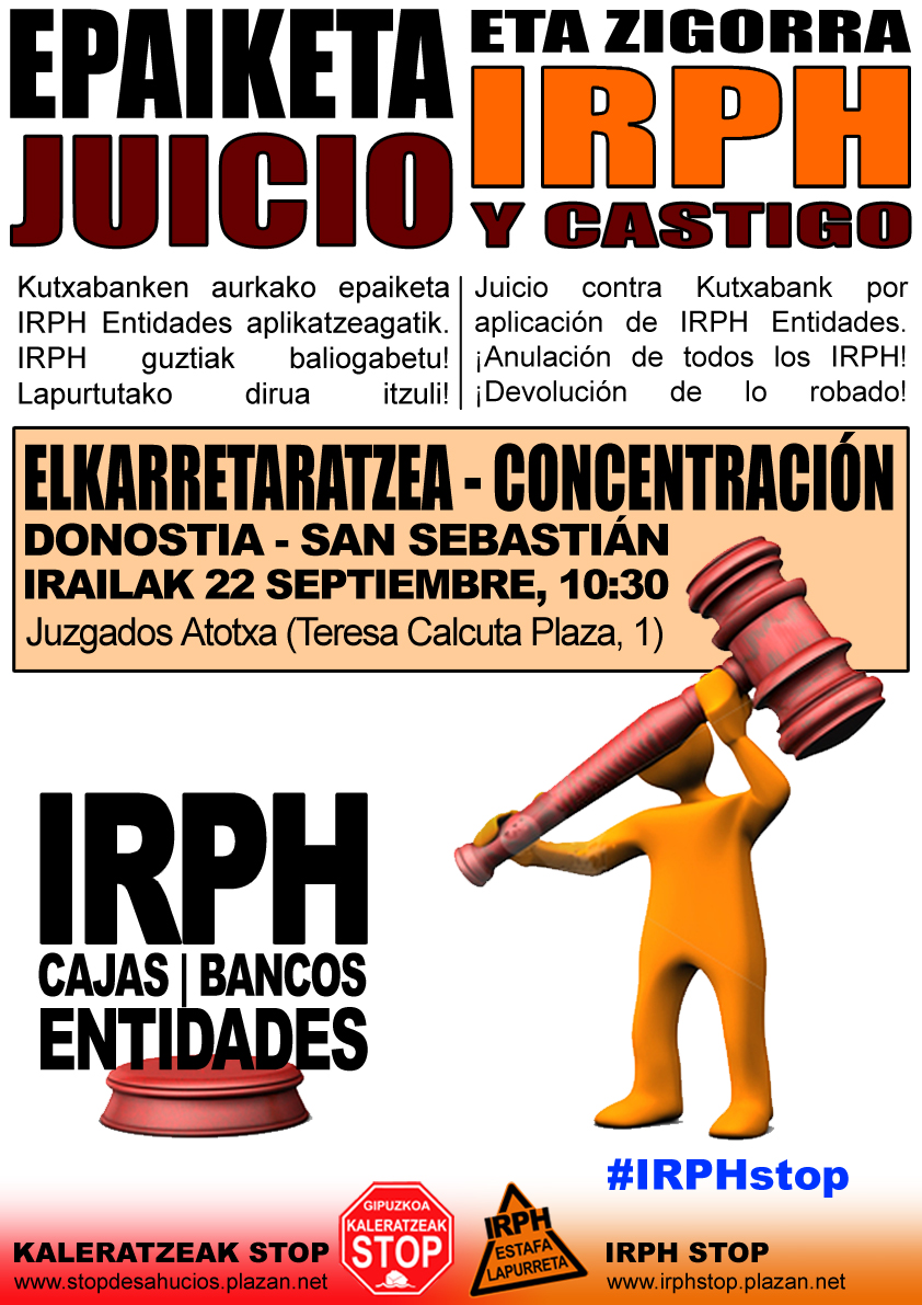 Irailaren 22an Donostiako epaitegian IRPH Entidades aplikatzeagatik Kutxabanken aurka jarririko salaketari dagokion epaiketa ospatuko da. Klausula hori bertan behera utzi eta maileguaren hasieratik bidegabe kobraturiko guztiak itzultzea eskatzen da. Epaitegi berdinak zigor hori jarri zion Kutxabanki IRPH Cajas aplikatzeagatik, eta beraz antzeko zerbait espero dezakegu. IRPH Entidades indizearen aurkako borrokan lehen garaipen judizial garrantzitsua litzateke. Indize kriminal hau oraindik ere indarrean dago eta milioitik gora familia kaltetzen ditu espainiar estatuan.