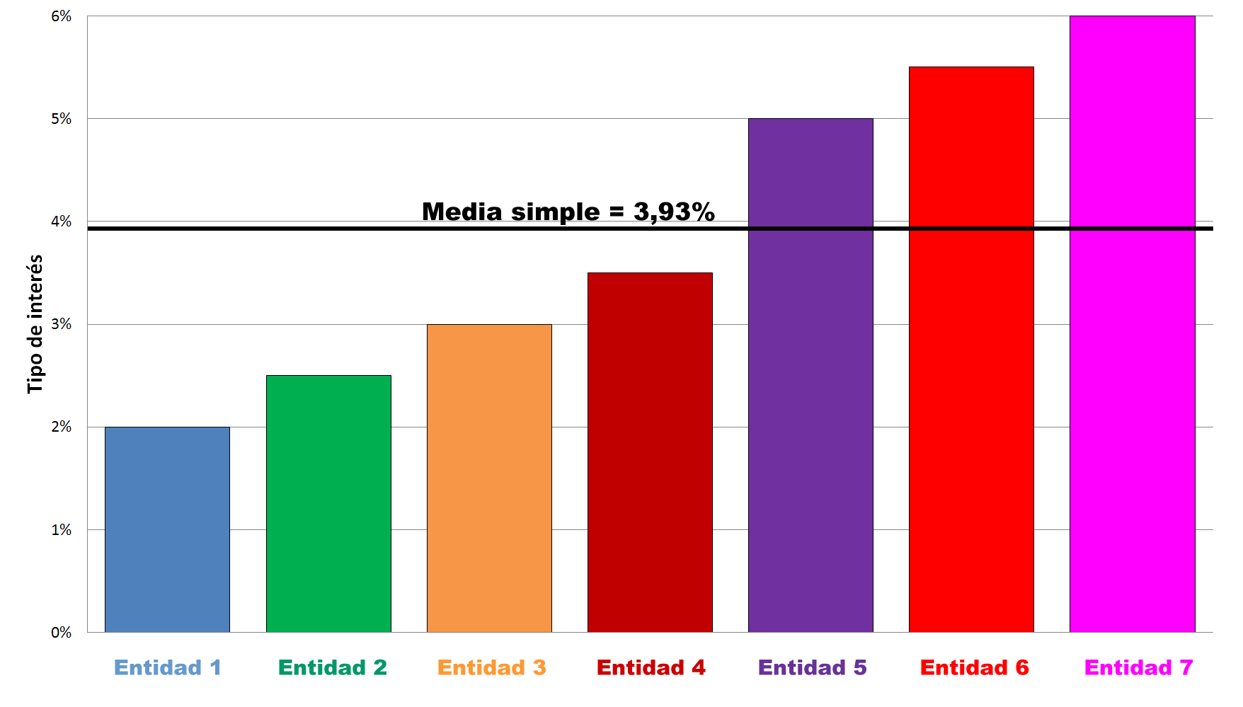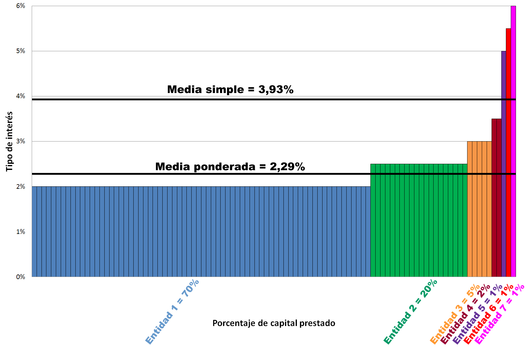 Adibide horretan, 7 entitate baldin baditugu, bakoitza kolore batetan, bataz besteko haztatuak %2,29 izaten jarraitzen du.